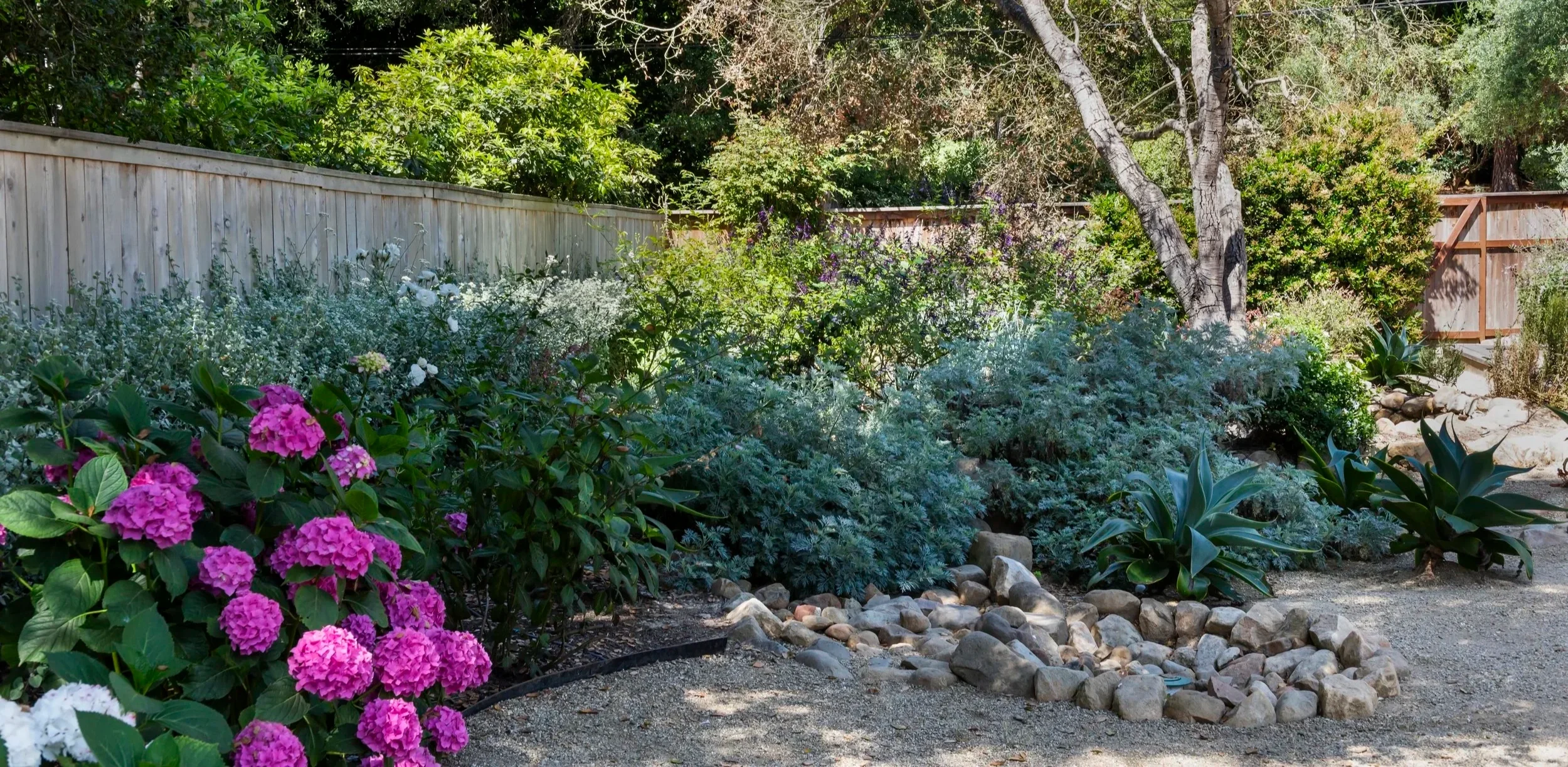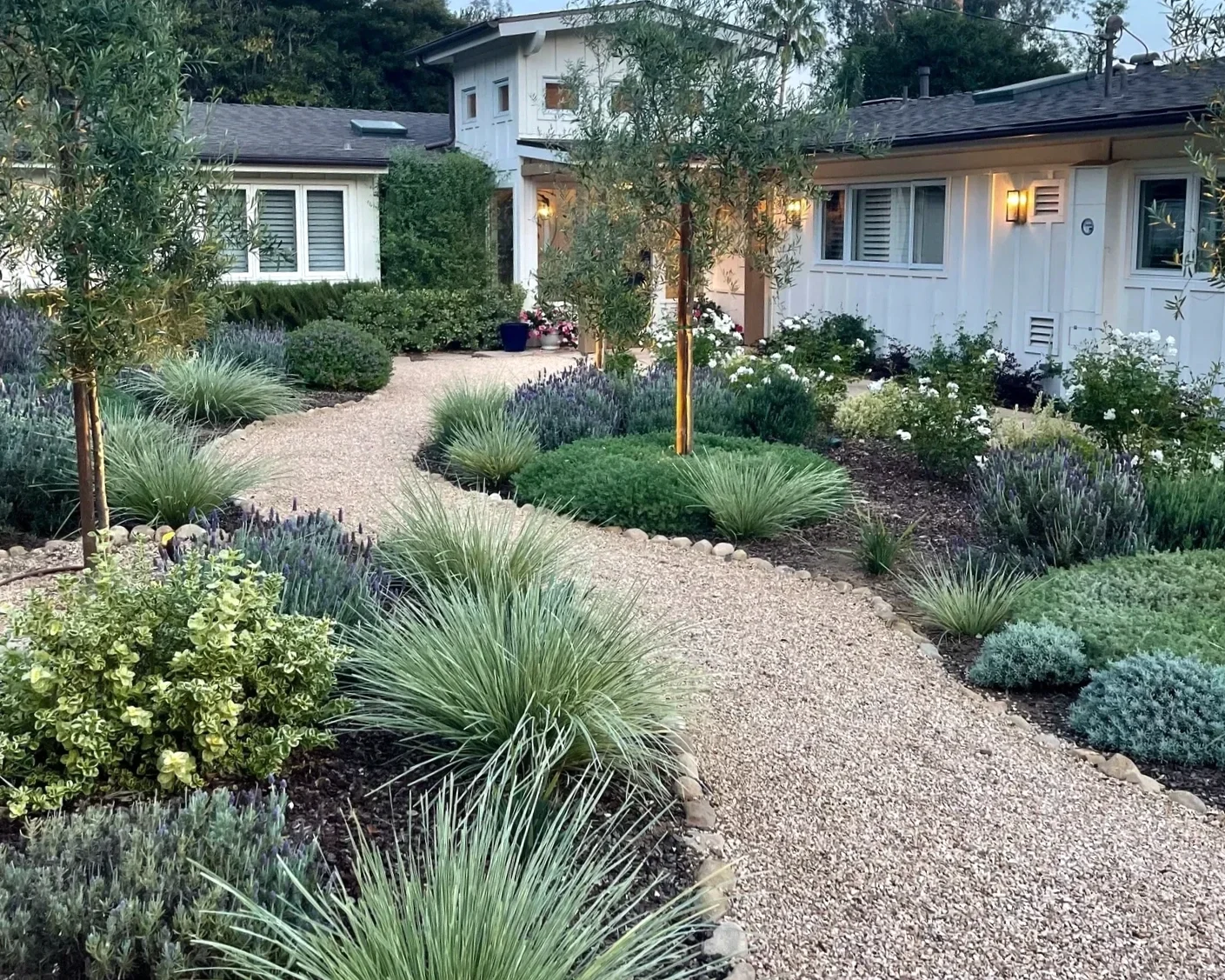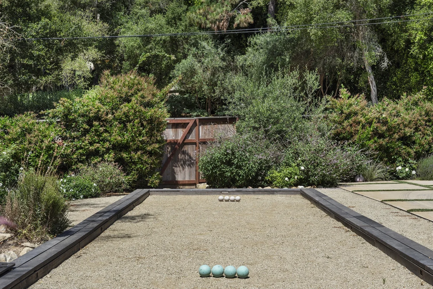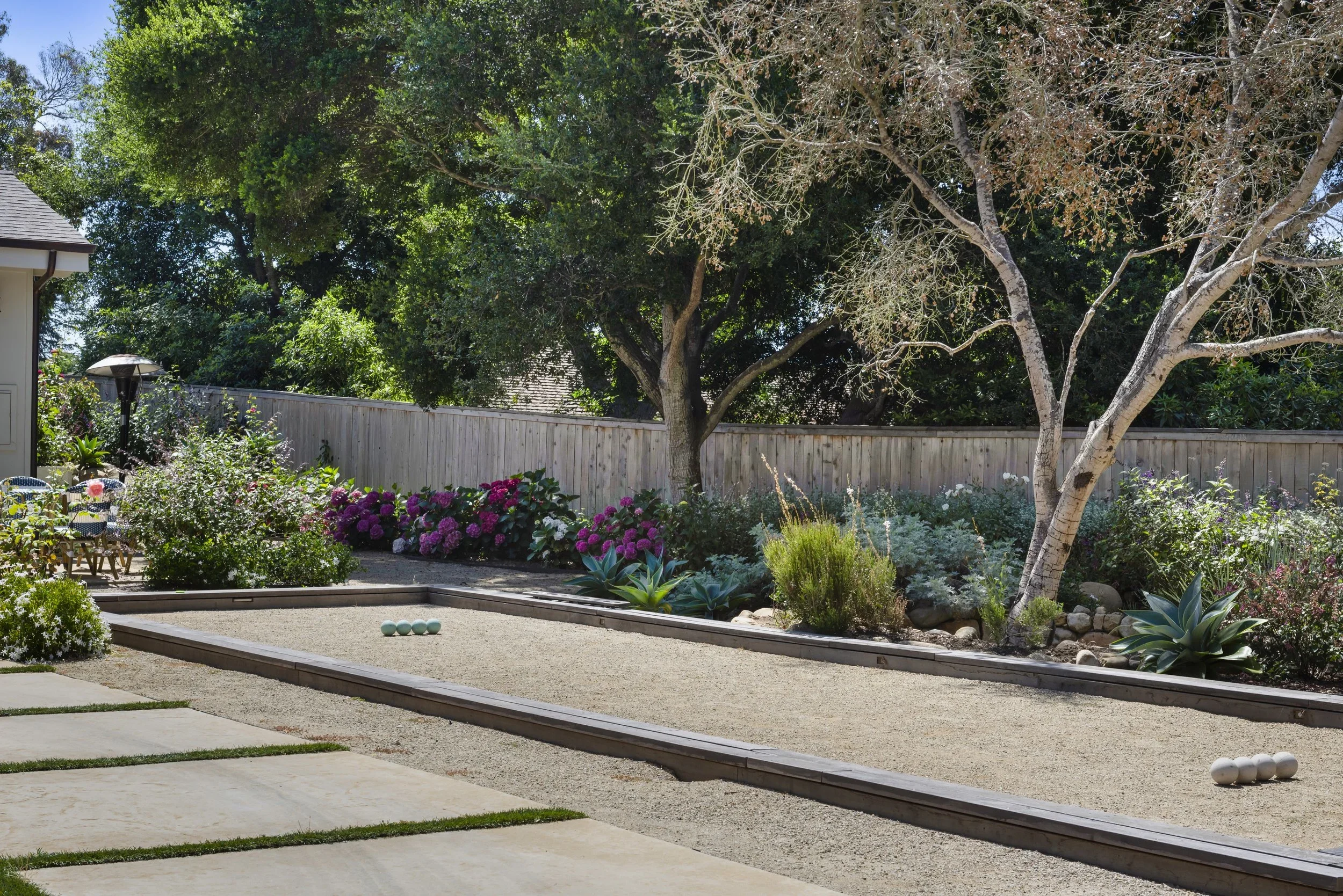 Project elements included a pool house and pool, custom fire pit, bocce court, rose cutting garden, driveway and bio swale for efficient water management.