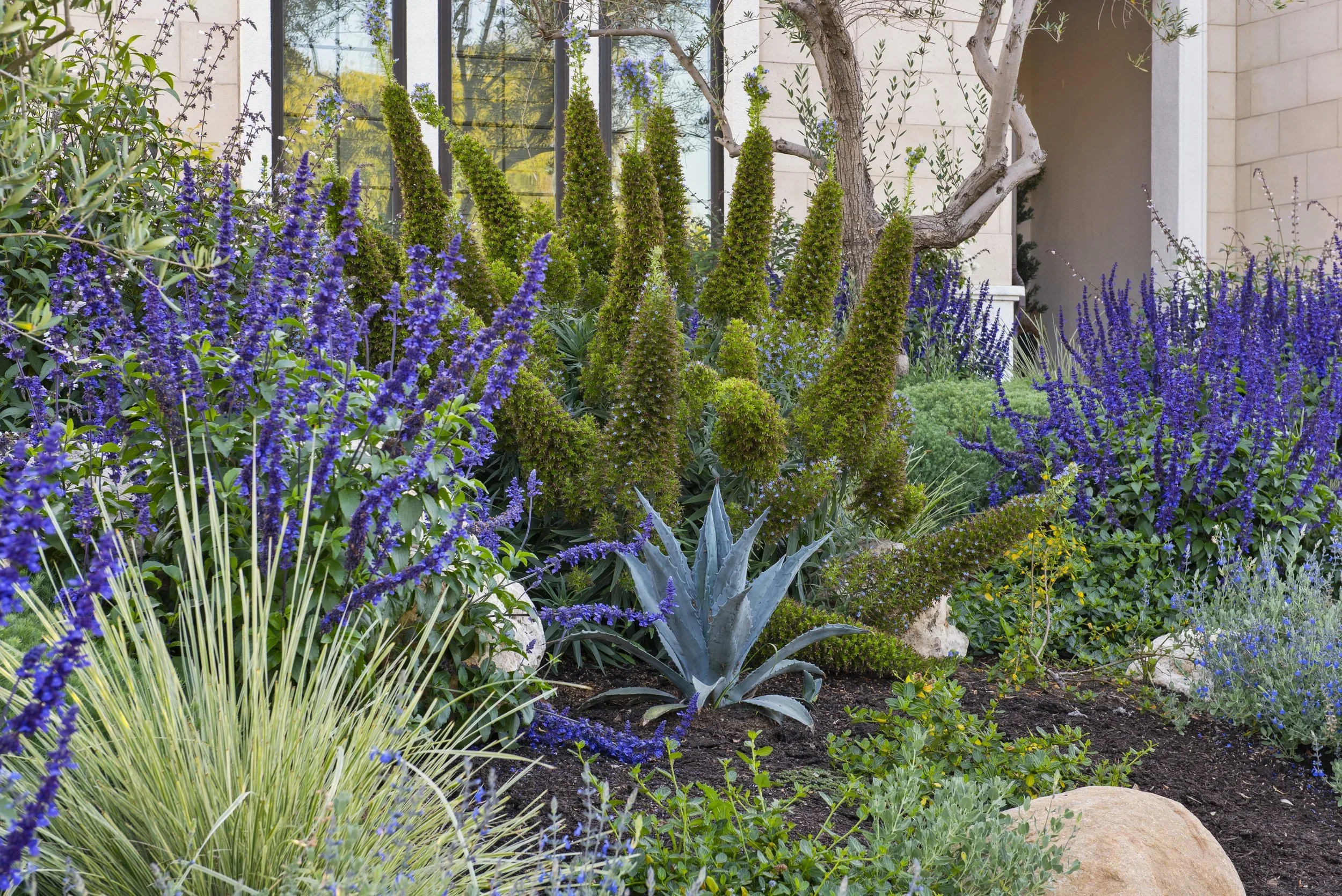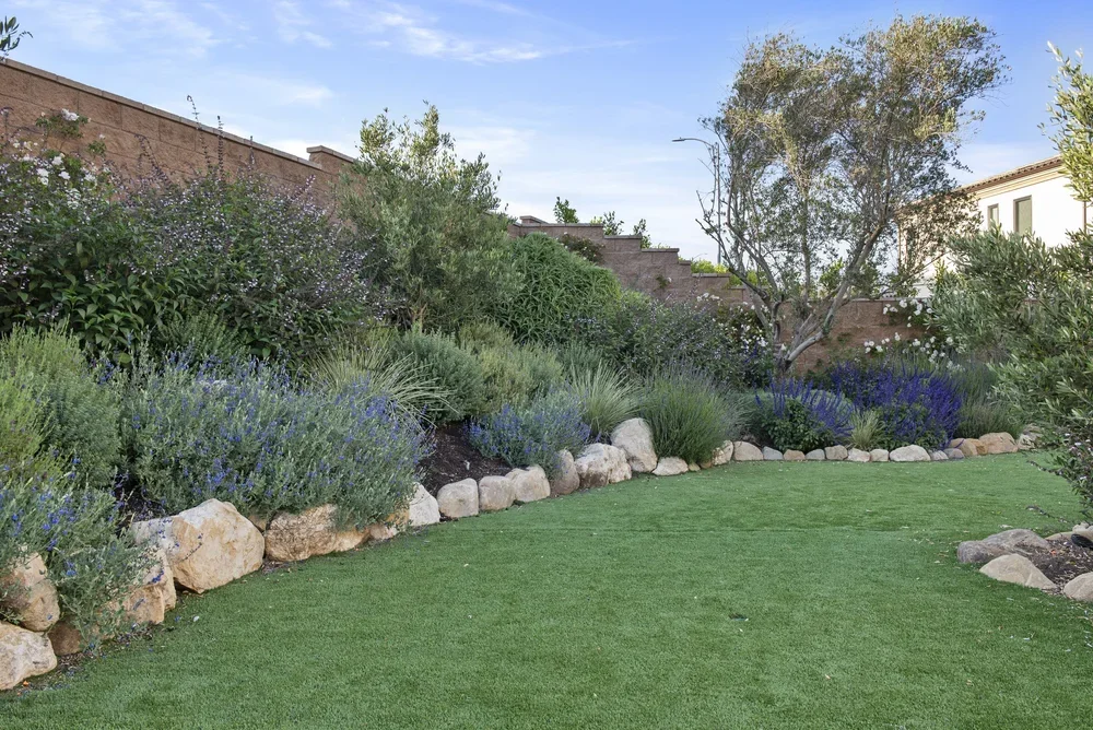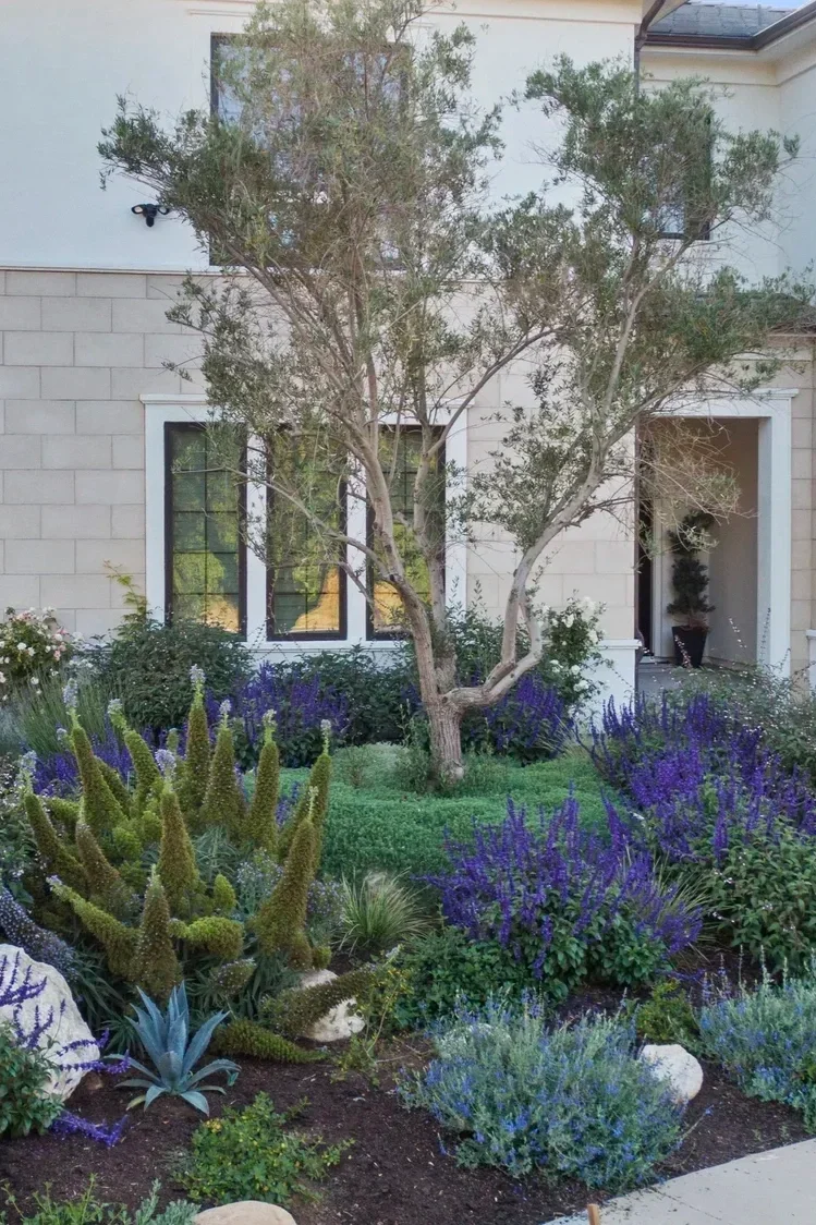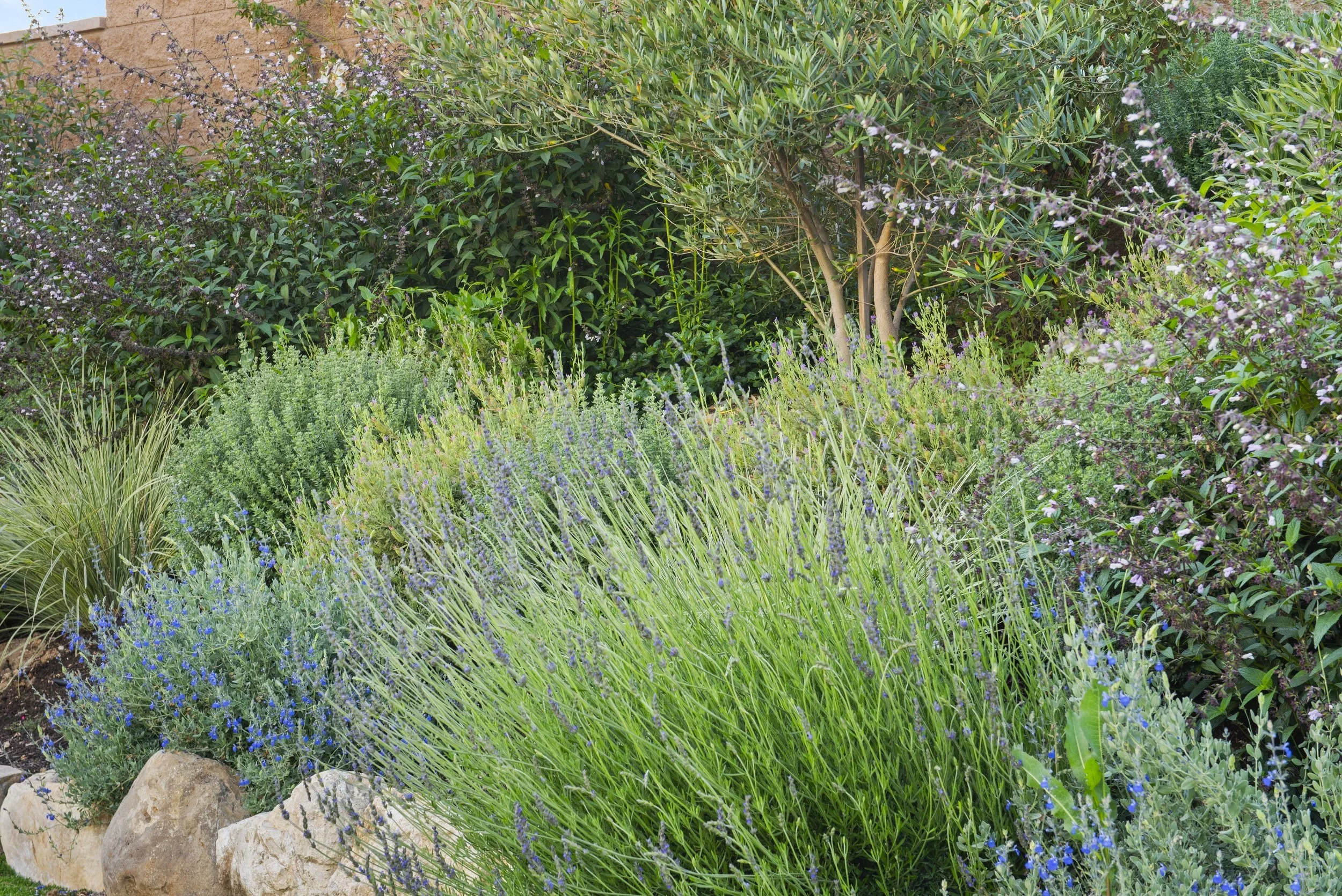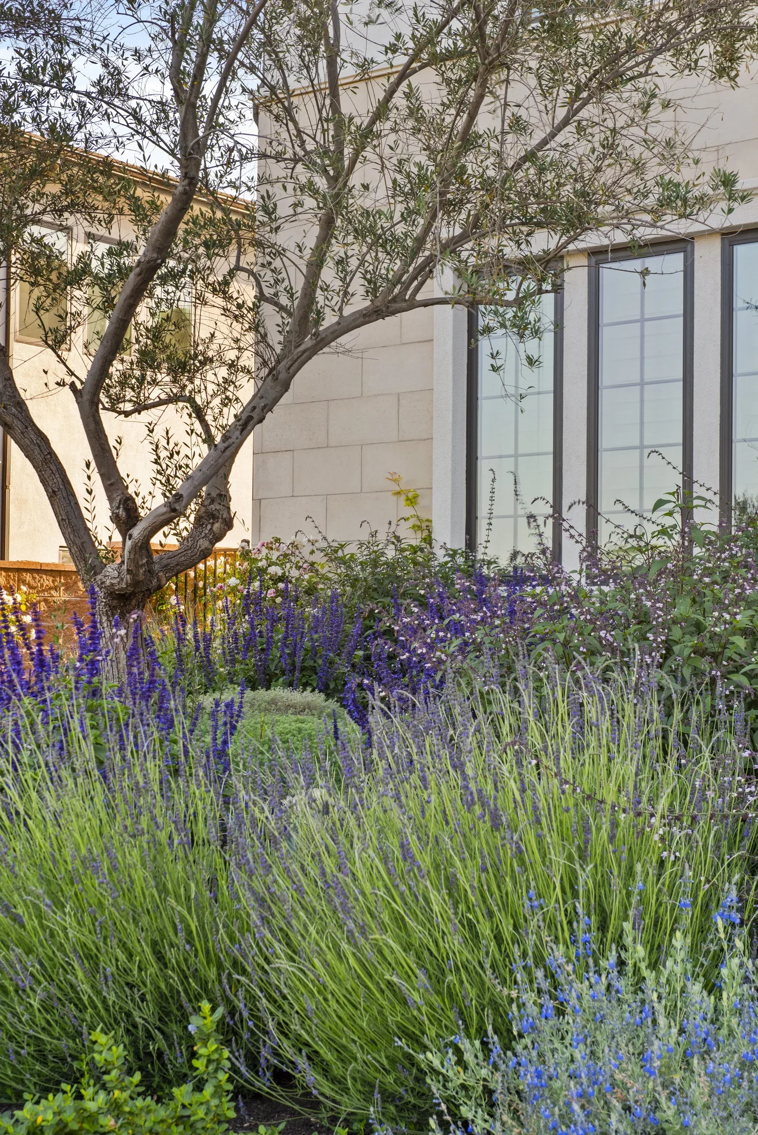 A lush, low maintenance design for year round color and interest with minimal upkeep. Old growth Olive Trees ground the space, with native pollinators and natural sandstone boulders.